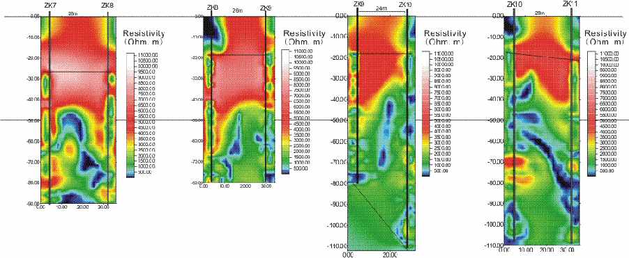 在ZK7和ZK8之间进行钻孔测试其中一个低电阻率区域的具体位置。测试结果显示,在纵深52米处发现泄露污水。从下面四个钻孔的电阻率分布图中,不难发现相邻的钻孔间电阻率的分布存在着连续性。所以说这样的井井电法勘探可以得到详细的地质信息。