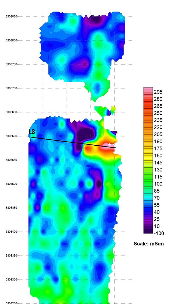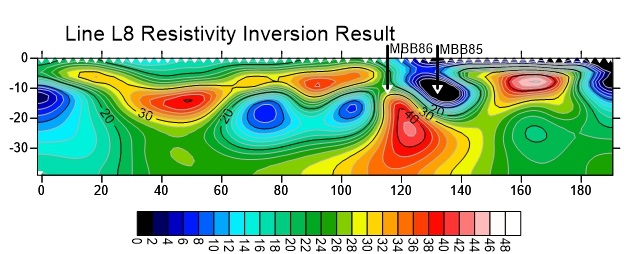 从第八条电缆所得到的电阻率反演图像可以发现在120米至140米,纵深0至10米区域为低电阻率带。与前期勘测结果吻合。