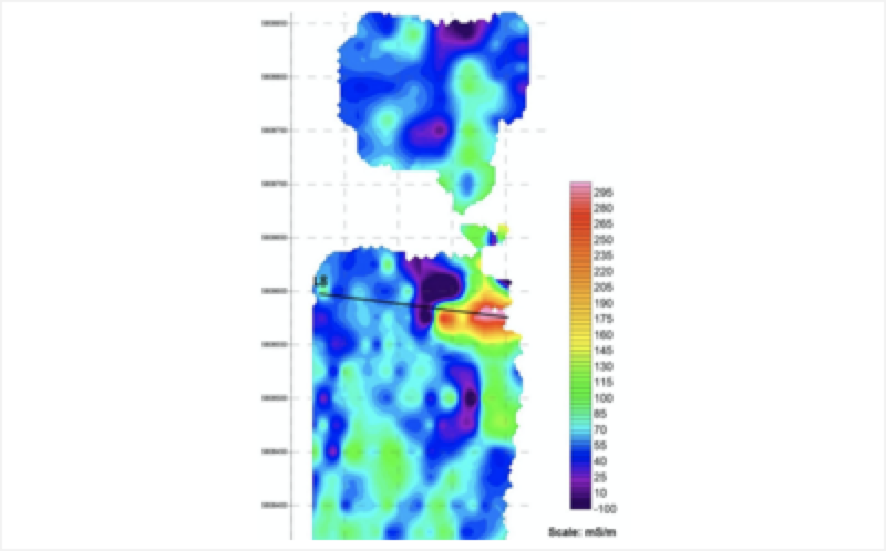 下图中显示,在地下45米以上的区域是具有高电阻率的石灰石岩层。在45米以下的区域大部分为中电阻率区域,并参夹低电阻率区域,分析结果显示原因可能是由于废水泄露或者地层断裂导致的。