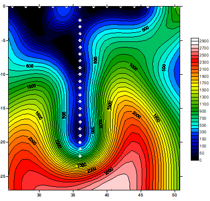 可以看出,-6米以上电阻率相对较低,结合当地地质情况推断,此地段为回填土;沿着桩基有一低阻区域,是由于桩基中注浆造成的;桩基底部5米范围内电阻率较高,岩石较完整。