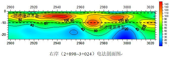 左岸桩号2+905~3+019段、右岸桩号2+898~3+024段防渗墙视电阻率基本正常,防渗墙均匀连续;左岸桩号3+019~3+031段视电阻率相对偏低,推测此处防渗墙连续性较其他部分差。